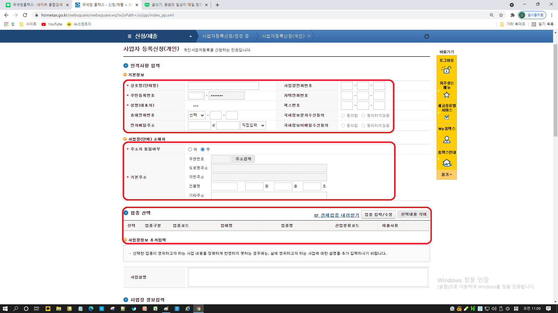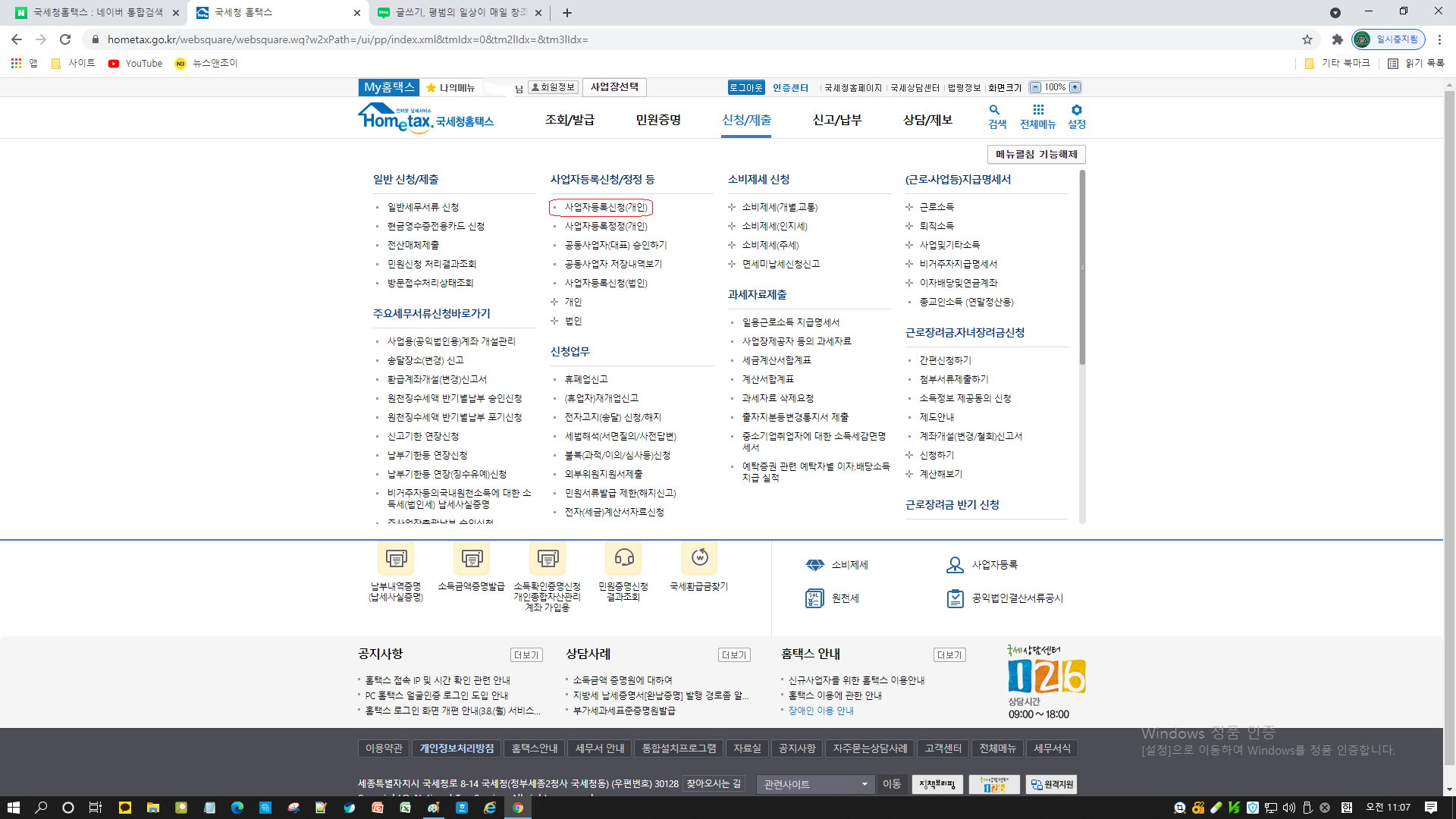 여기서 사업자등록신청/정정등 에서 첫번째 사업자등록신청(개인)을 누르시면 됩니다.