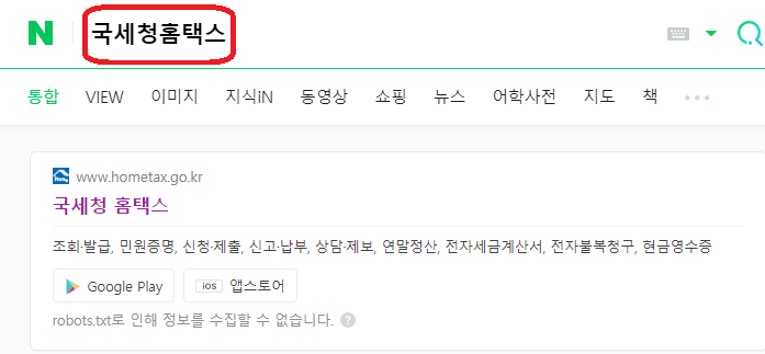 먼저, 네이버, 다음 사이트에서 국세청홈택스을 치시고 엔터키를 누르시면
